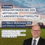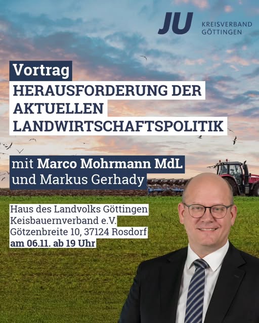 04.11.25 Der CDU Landtagsabgeordnete und Experte für Landwirtschaft Dr. Marco Mohrmann kommt auf Einladung der Jungen Union Göttingen am 6.11.25 um 19 Uhr ins Landvolkhaus nach Rosdorf – Gäste sind gern gesehen.