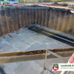 Ein erhebliches Ausmaß haben die Baugruben am Start und Ziel der Bohrung, Diese sind ca. 7m tief und haben ein Ausmaß von ca. 14 x 17 m. Die 70 cm starke Bodenplatte wird dann das Bohrgerät tragen und ist entsprechend stark dimensioniert. Erhebliche Mengen an Erdaushub entstehen.