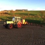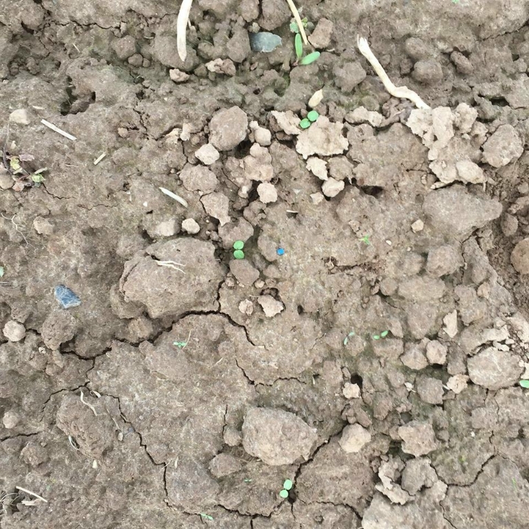 Neben den Rüben sind mittlerweile auch Unkräuter aufgelaufen. In einem frühen Stadium (am besten direkt nach dem Keimen) lassen sich diese leichter (mit wenig Wirkstoff) und für die Rüben schonender bekämpfen. Die Pflanzenschutzmaßnahmen werden häufig in den Abendstunden durchgeführt, da dann die Verträglichkeit und die Wirkungssicherheit am höchsten ist. Das blaue Korn in der Mitte des zweiten Bildes ist ein Schneckenkorn (s. letzter Bericht).