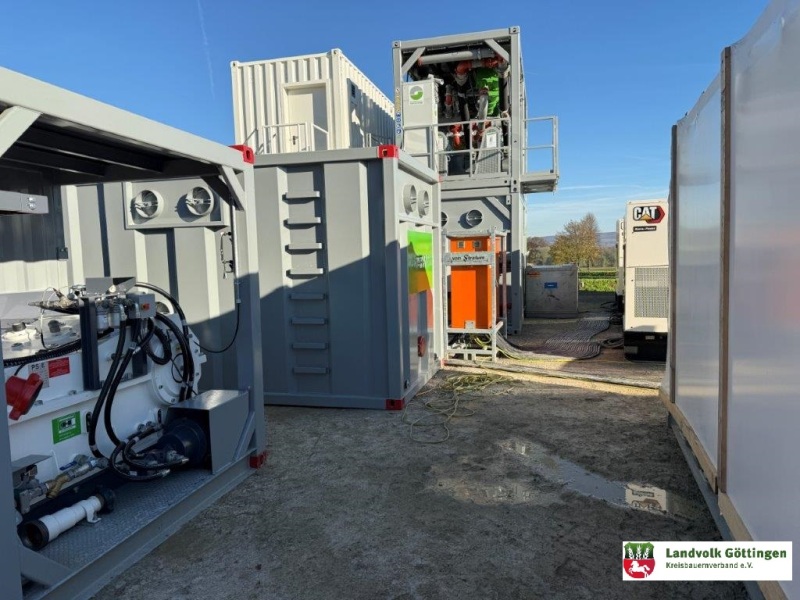 06.11.25 Heute ergab sich die Möglichkeit die Einrichtung der EPP Baustelle beim Suedlink anzuschauen. Im Landkreis Göttingen ist die TransnetBW für Planung und Bau verantwortlich. Eine beeindruckende technische Herausforderung mit wirklich großem Umfang. EEP steht für E-Power Pipe, also ein Bohrverfahren was mit einem Durchmesser von gut 50cm die Löcher für die Leerrohre des SuedLink bohren wird. Dabei sind Bohrlägen von bis zu 2.000 m möglich, täglich sind 200m Bohrfortschritt geplant. Die bekannten HDD Bohrungen konnten bisher bis ca. 500 m Länge eingesetzt werden. Neben dem Bohren selbst hat die Aufbereitungstechnik für die Bohrlösung einen erheblichen Umfang, die Anzahl der Container macht das deutlich.