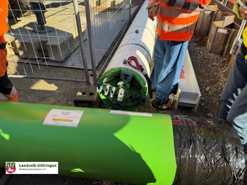 Am Zielloch werden bereits die Rohre verschweißt, die nach der Bohrung dann rückwärts mit dem Bohrer durch das entstandene Loch gezogen werden.