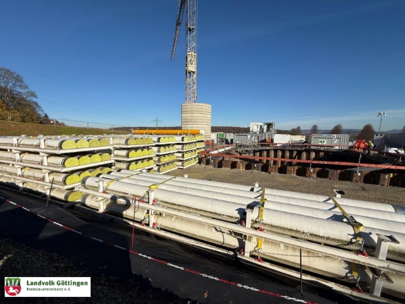 06.11.25 Heute ergab sich die Möglichkeit die Einrichtung der EPP Baustelle beim Suedlink anzuschauen. Im Landkreis Göttingen ist die TransnetBW für Planung und Bau verantwortlich. Eine beeindruckende technische Herausforderung mit wirklich großem Umfang. EEP steht für E-Power Pipe, also ein Bohrverfahren was mit einem Durchmesser von gut 50cm die Löcher für die Leerrohre des SuedLink bohren wird. Dabei sind Bohrlägen von bis zu 2.000 m möglich, täglich sind 200m Bohrfortschritt geplant. Die bekannten HDD Bohrungen konnten bisher bis ca. 500 m Länge eingesetzt werden. Neben dem Bohren selbst hat die Aufbereitungstechnik für die Bohrlösung einen erheblichen Umfang, die Anzahl der Container macht das deutlich.