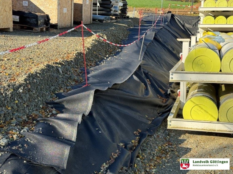 Soweit wir das beurteilen konnten ist die Baustelle ordnungsgemäß eingerichtet, Bodenschutzmaßnahmen sind erfolgt, die Erdmieten sind begrünt, trennendes Flies ist verlegt, Baggermatten sind ausgelegt und Schotter ist verbaut. .