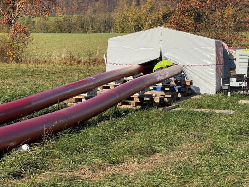 Am Zielloch werden bereits die Rohre verschweißt, die nach der Bohrung dann rückwärts mit dem Bohrer durch das entstandene Loch gezogen werden.